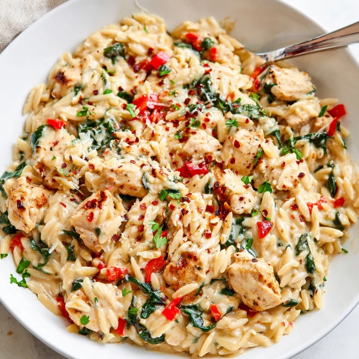 This hearty one-pot dish combines diced chicken breast with orzo pasta in a creamy Cajun-spiced Alfredo sauce. The chicken is seasoned with Cajun spices and browned first, then cooked alongside onions, red bell peppers, and garlic in a rich broth and cream base. As the orzo simmers, it absorbs all those bold flavors while creating its own thick, luscious sauce. Finished with Parmesan cheese and fresh parsley, this dish delivers restaurant-quality comfort food with minimal cleanup.