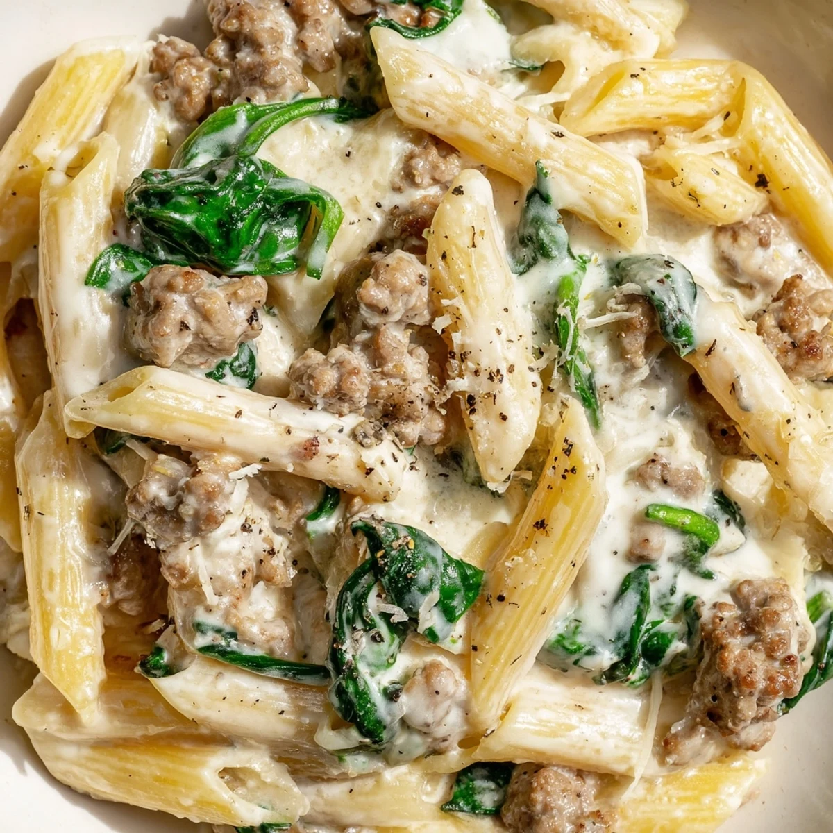The first time I made this on a Tuesday evening after discovering lentil pasta at the grocery store, my husband actually asked if I'd ordered takeout. That creamy sauce clings to every bite, and the way the beef mingles with the spinach creates something that feels indulgent while hitting every protein goal.