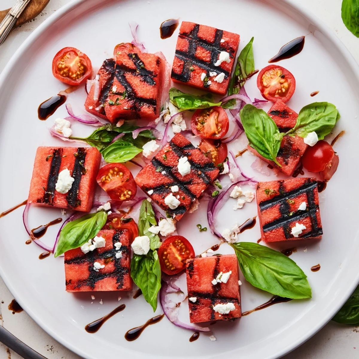 - Scatter crumbled feta across the top and tuck fresh basil leaves between the pieces. Finish with olive oil, balsamic glaze, and lime juice. Season gently, then serve immediately while the watermelon still has that slight warmth from the grill.