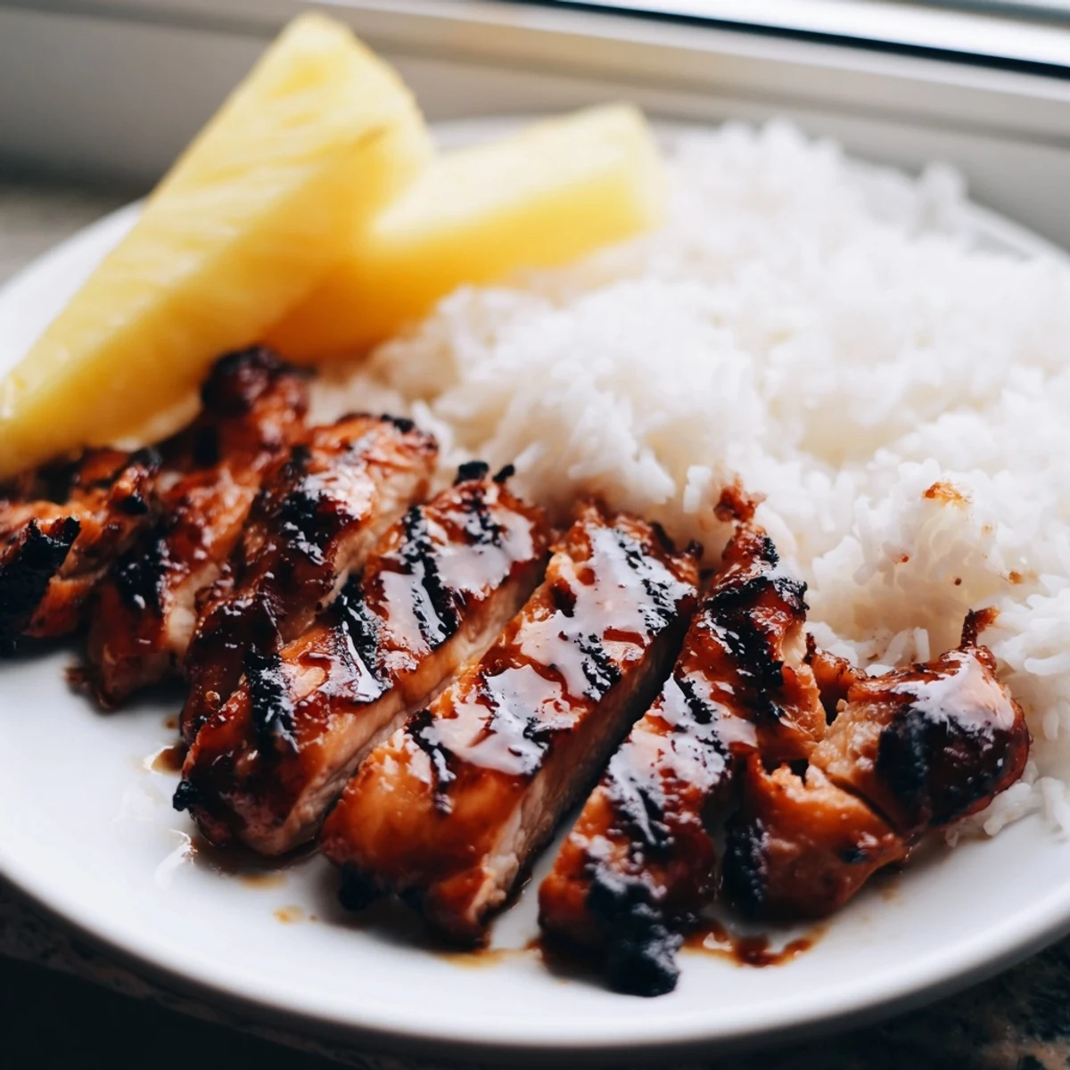 Succulent chicken thighs soak up a tropical marinade of soy sauce, honey, pineapple juice, garlic, and ginger before hitting the grill. Meanwhile, jasmine rice simmers in rich coconut milk until perfectly fluffy. The finished dish brings together caramelized chicken, creamy coconut rice, and fresh pineapple cubes for a complete meal that captures the essence of Hawaiian cuisine.