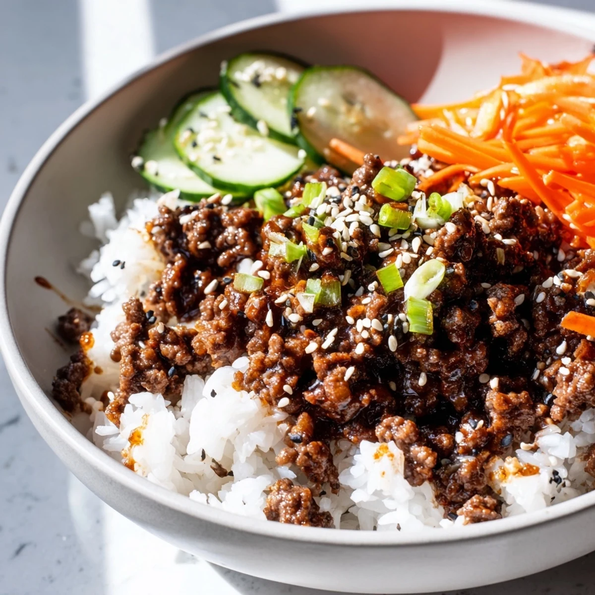 - Divide the steaming rice among four bowls and spoon the saucy beef generously over the top. Arrange the carrots, cucumber, and scallions in sections around the beef, then finish with a generous sprinkle of toasted sesame seeds and any optional toppings you love.