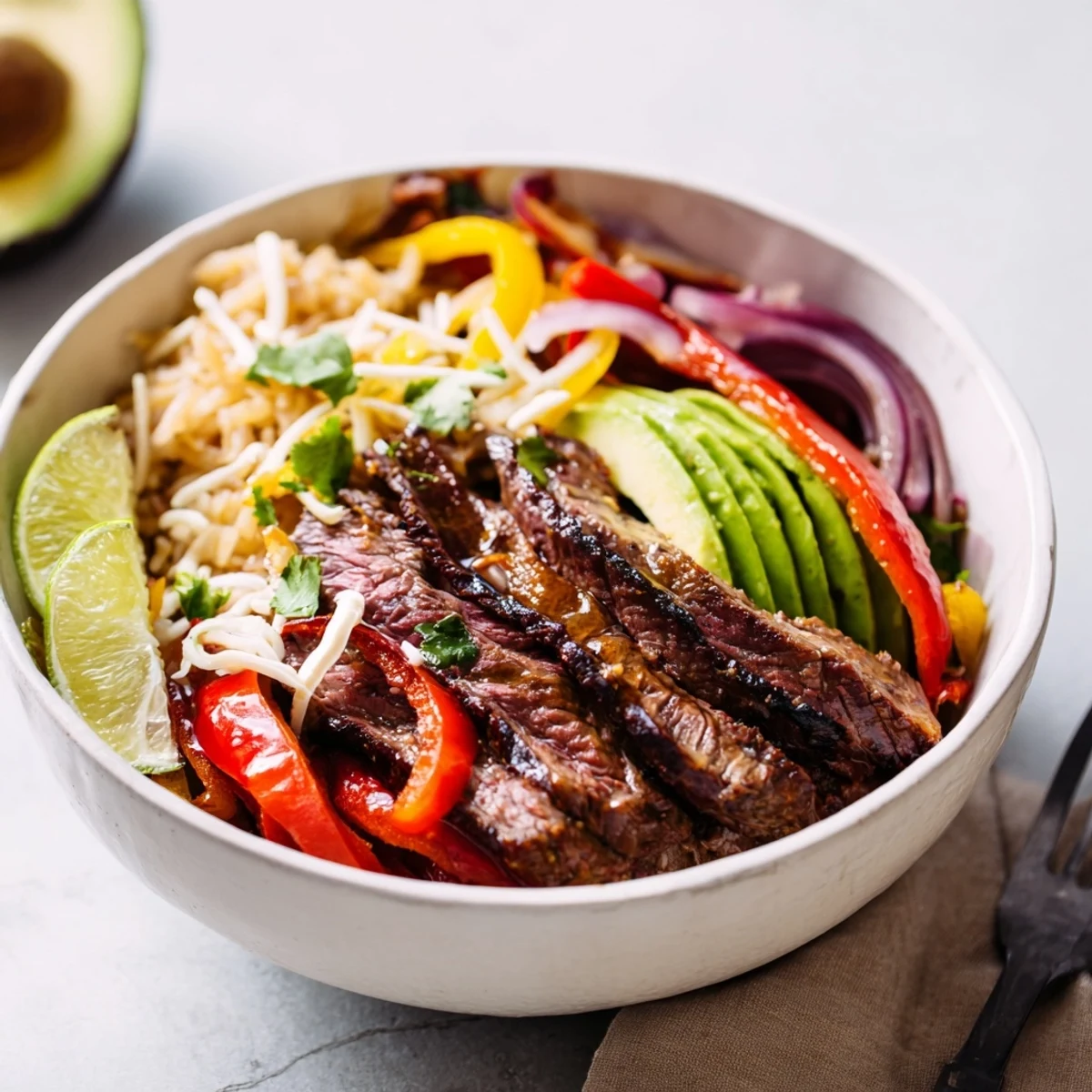 Marinate thinly sliced flank or sirloin in lime, soy, garlic and spices, then sear quickly for tender, flavorful strips. Sauté red, yellow and green peppers with red onion until just tender. Warm black beans and brown rice or quinoa, then assemble bowls with grains, beans, steak, vegetables, avocado, tomatoes and cheese. Finish with cilantro, lime and a dollop of yogurt for brightness.