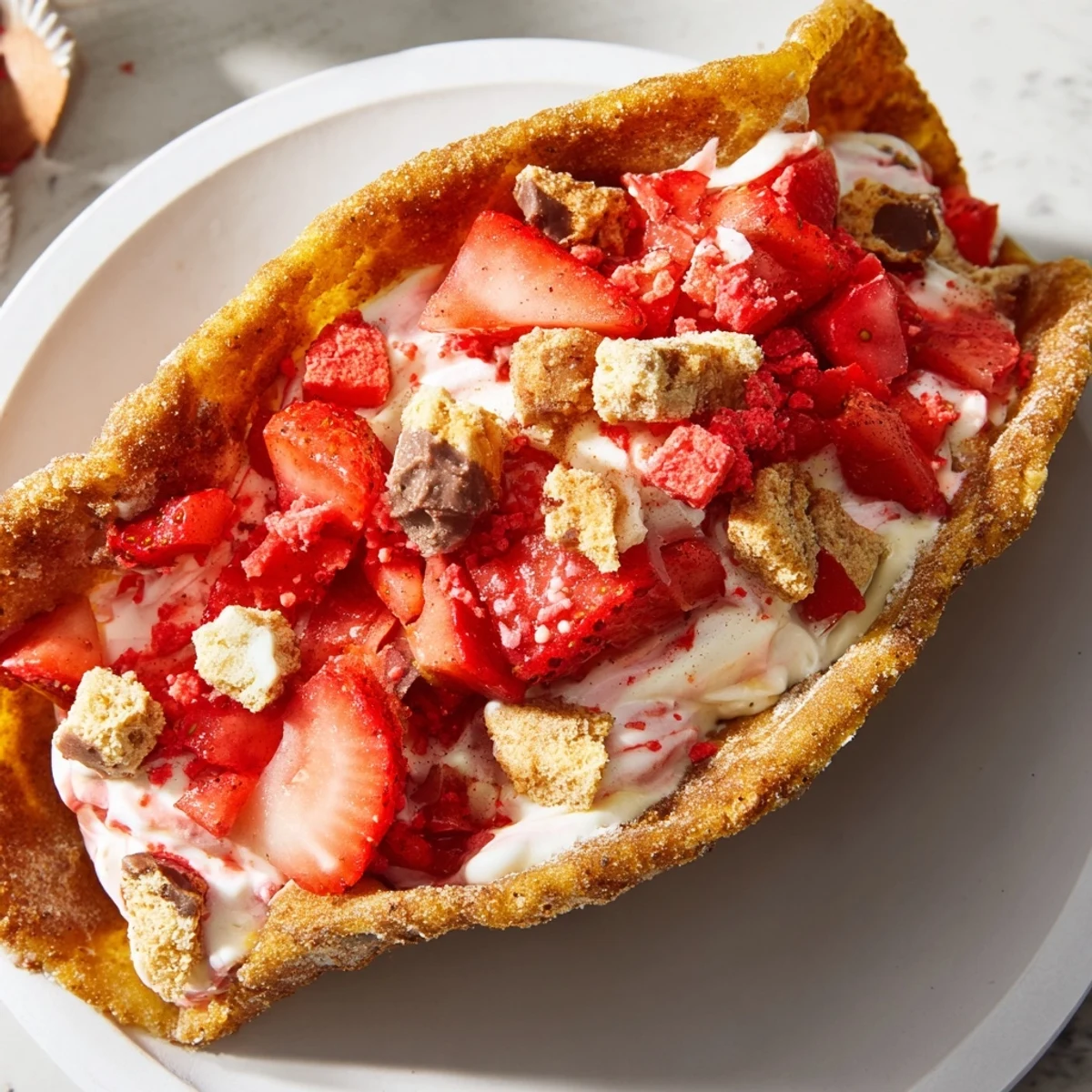Transform flour tortillas into crispy cinnamon-sugar shells, then pipe in fluffy cheesecake filling loaded with fresh macerated strawberries. Finish with a buttery crumble of crushed vanilla cookies and freeze-dried strawberries for texture that pops.