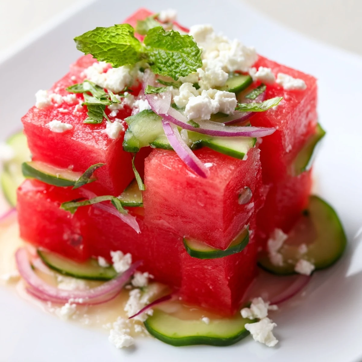 You can cube the watermelon and slice the vegetables up to 4 hours in advance. Store them separately in the refrigerator. Add the dressing and mint just before serving to maintain the crisp texture and prevent the watermelon from becoming watery.